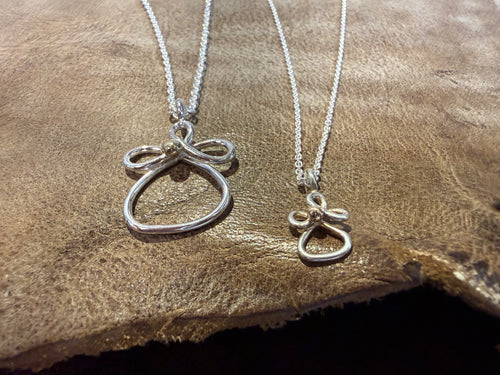 Englene er rustikke vedhæng i sølv eller guld, skabt med samme rå skønhed og håndlavede udtryk som vores Vesterhavssmykker. De er formet i hånden – lidt skæve, lidt bløde, og helt unikke