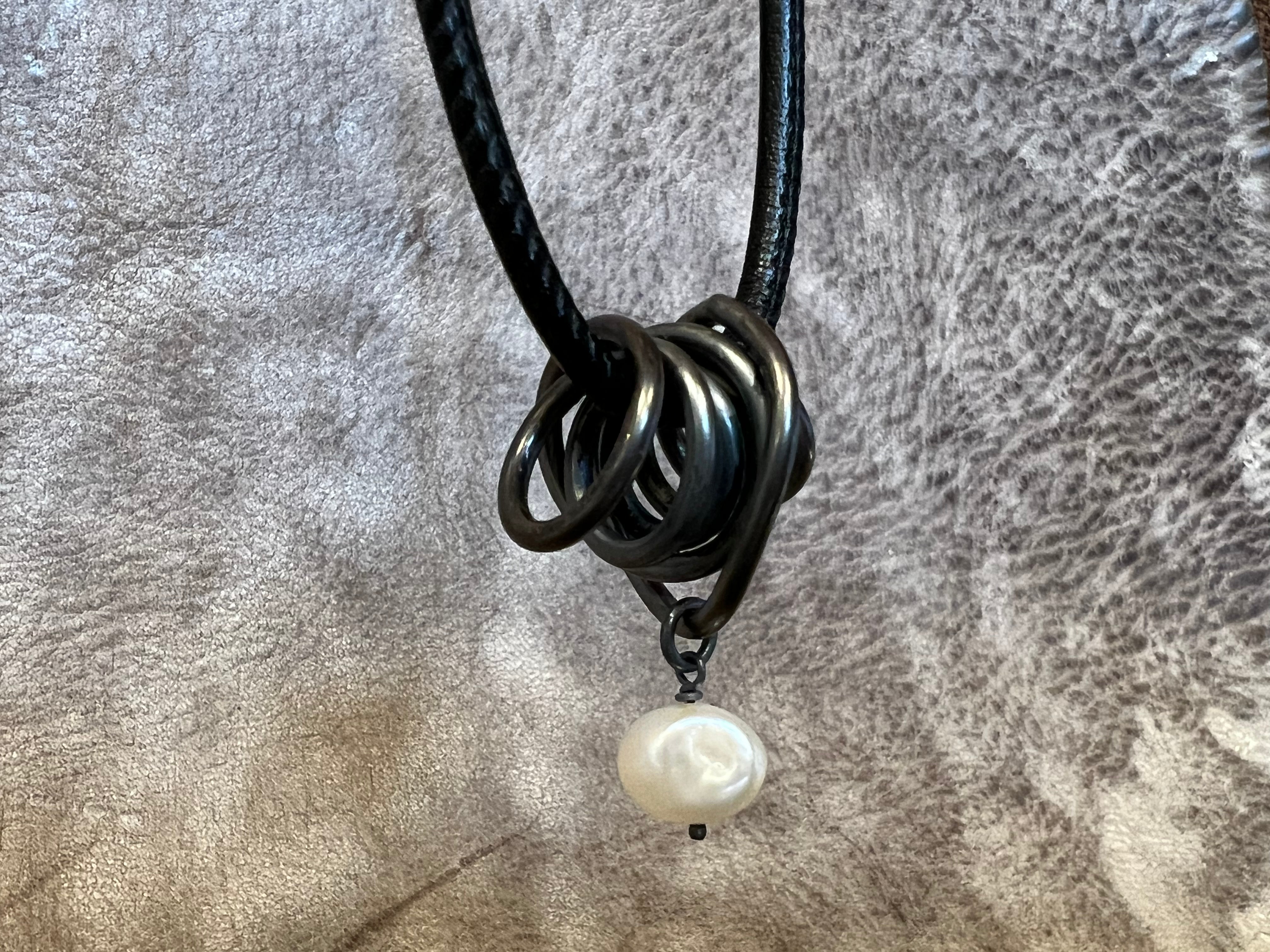 Håndlavet rustik vedhæng i oxideret kobber som giver denne skønne patineret overflade - i vedhænget hænger en ferskvands perle.